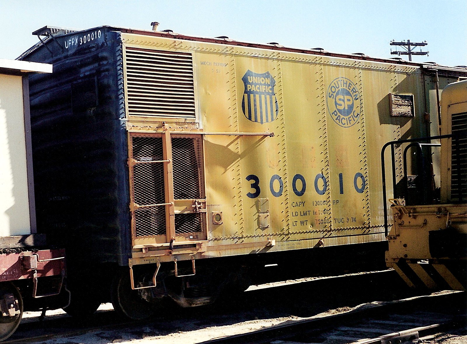 In June 1985, UPRX #300010 was donated to the PSRMA by the Union Pacific Railroad, its first donation to the Museum. Brought to Colton, CA by the UP, it was taken to San Diego by the Santa Fe and to the Grossmont industrial siding in La Mesa by the SD&IV free of charge in September 1985. In February 1987, the SD&IV moved it to San Ysidro, and it went to Campo on the Museum's "Great Freight II" on February 28, 1987. It was steam-cleaned in July 1987, using a "Rig-Shine" machine, which removed most (but not all) of the UPRX letters on the car's sides.