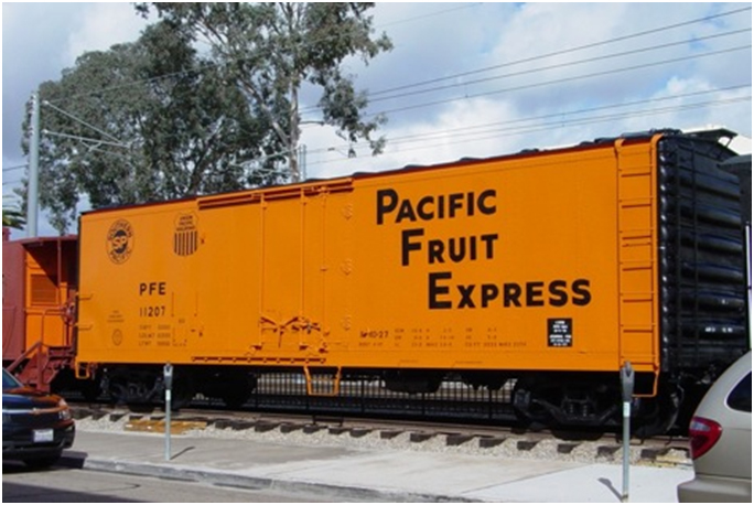 The Pacific Fruit Express Company was created as a joint venture of the Southern Pacific and Union Pacific railroads in the early 1900s by Edward Harriman, who controlled both. It was dissolved in March 1978, and its assets divided. SP retained the Pacific Fruit Express name, while UP named its half Union Pacific Fruit Express. This Class R-40-27 steel "reefer" went to SP's PFE in March 1978.