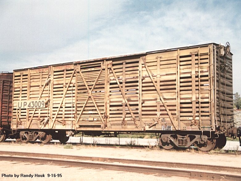 The 270 cars in its class (UP #43000-43269) were especially built for UP's high-speed DLS (Daylight Livestock Special) which carried hogs from Salt Lake City to Los Angeles in 27-30 hours, complying with federal law requiring stock be unloaded, fed and rested every 36 hours. The hogs went to the Farmer John Brand Meats Division of the Clougherty Packing Company, which bought them in the midwest, and shipped them live to its slaughter house and packing plant in Vernon, CA. (Most processors slaughtered their hogs in the midwest and shipped frozen carcasses or processed pork to the west coast). In 1976 the train was renamed CLS (California Livestock Special). It was discontinued in 1985, and the stock cars were added to UP's hotshot Chicago-Los Angeles CSLAZ trailer train at Salt Lake City.