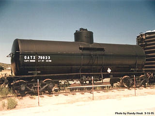 GATX #79923 was completely cleaned, repaired, and repainted black with white lettering in July 1987 by a restoration crew of the museum's volunteer workers. It is now on display in operating condition on the museum's freight car line near the Campo depot.