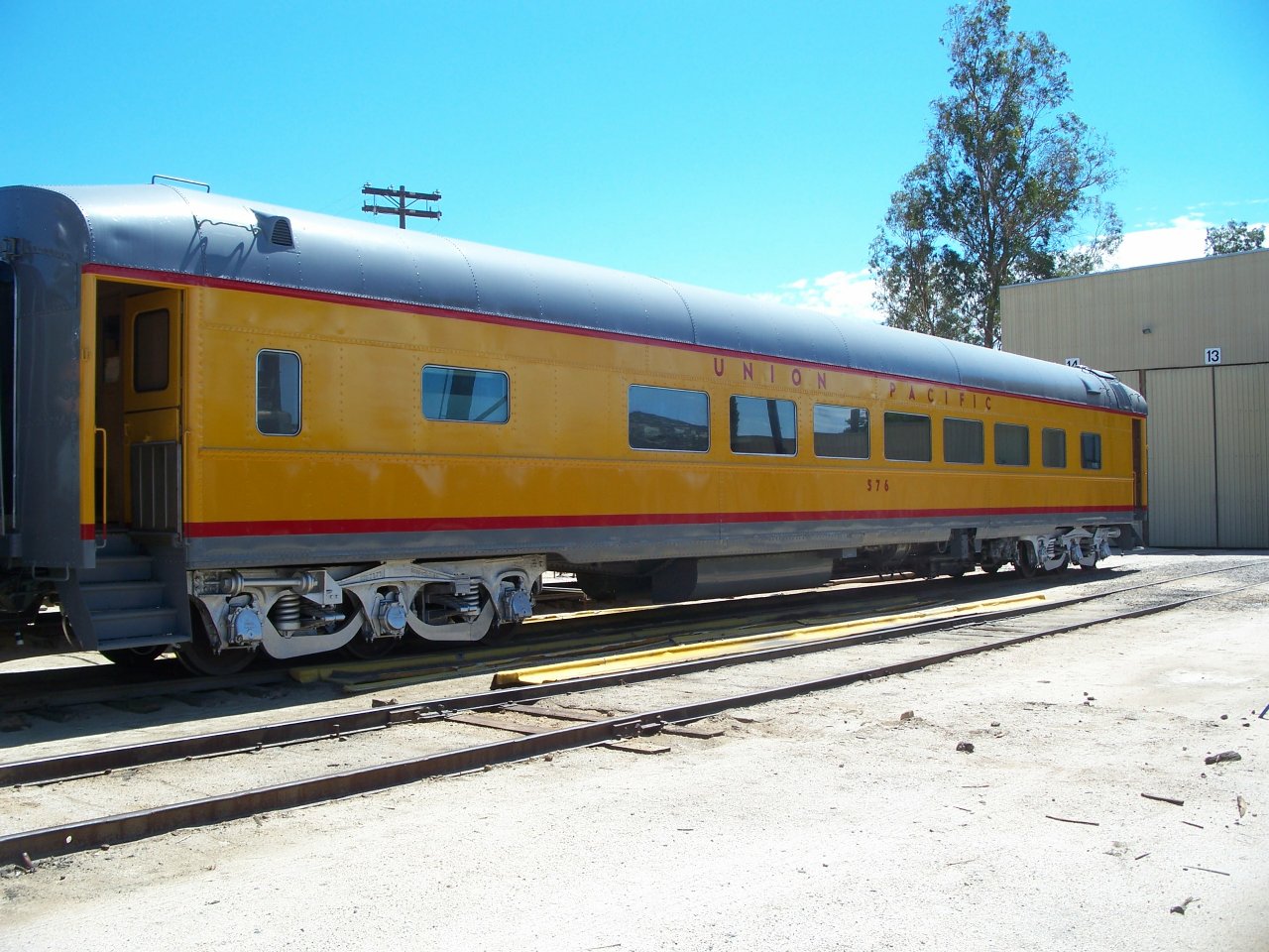 UP #576 was cleaned, repaired, and in mid-1977 repainted Pullman green, because no supply of the Armour yellow paint was available. In late 1980 it was again refurbished and repainted Armour yellow. UP #576 was moved to La Mesa depot in September 1981, exhibited, and used on the La Mesa Cannonball May 23, 1982, the museum-operated first passenger train on SD&AE's El Cajon branch in 54 years. It went to Campo in July 1983 on the museum's first "Great Freight", on which it unexpectedly served as an overnight coach. It was used on the first museum SD&A excursion trains starting January 4, 1986. It's now used only in cool weather, as its air-conditioning can't operate effectively at the slow speeds of museum trains and it has sealed windows. Four similar cars, including UP #582 and possibly #577 are built into Solana Station Restaurant in Solana Beach,CA.