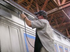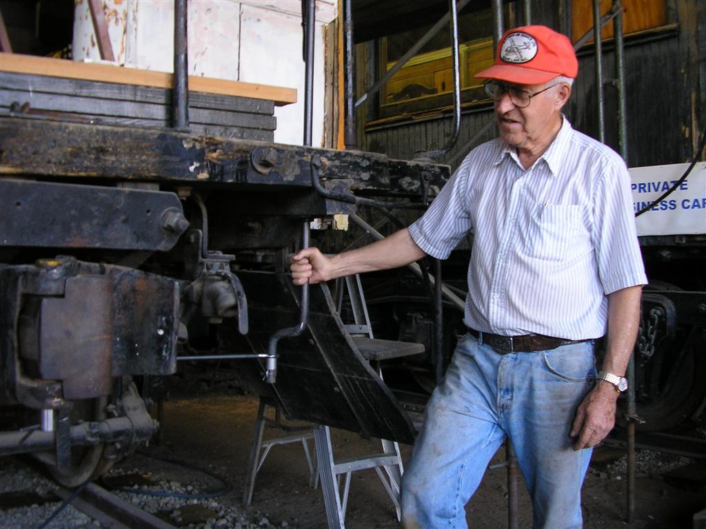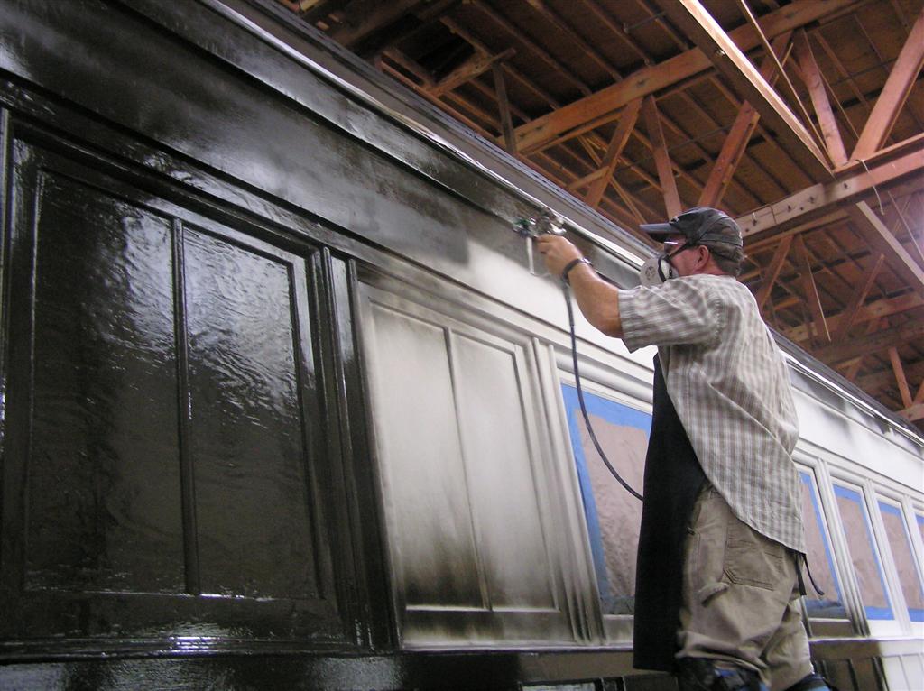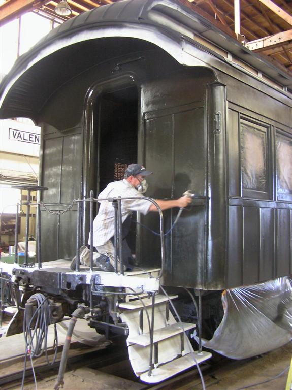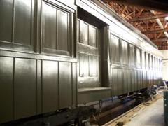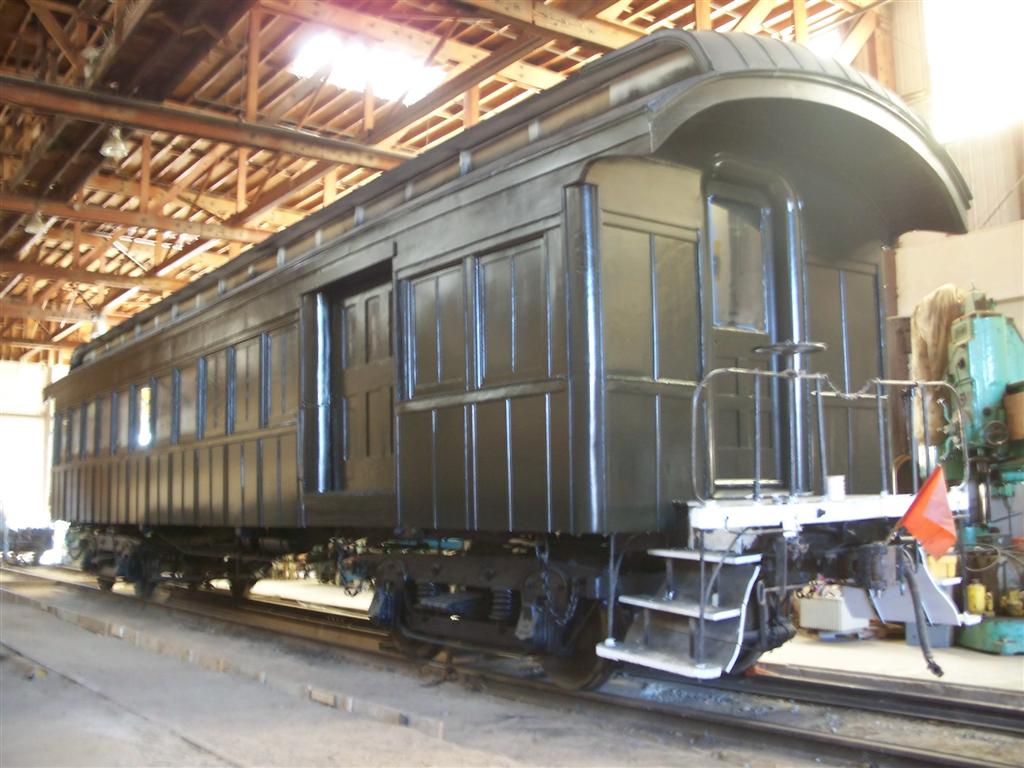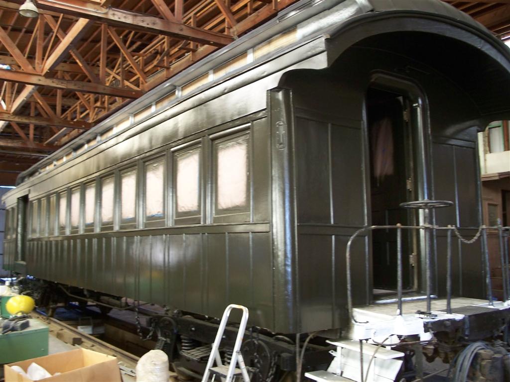 The car is being restored to its 1936-1945 Jim Crow years, when it operated as the Rockdale, Sandow & Southern's sole passenger car. Exterior restoration will be completed by the end of 2008, carried out by the Museum's 4-man restoration crew: Harold Whalen, Frank Stites, Bob Gerdes, and Ted Kornweibel, Superintendent of Restoration. The car's exterior was painted in September 2008 by master-painter Mark Gerdes. Interior restoration, including reupholstered seats and replica ceiling oil lamps, was finished in 2009. A $3,000 grant from the National Railway Historical Society, awarded in 2008, will help pay for recovering the seats and casting 90 replica pieces of clerestory glass. Now finished, the car is on view in the Display Building, accompanied by the Museum's African American railroad heritage display, the most comprehensive photographic exhibit about black railroaders in the country.