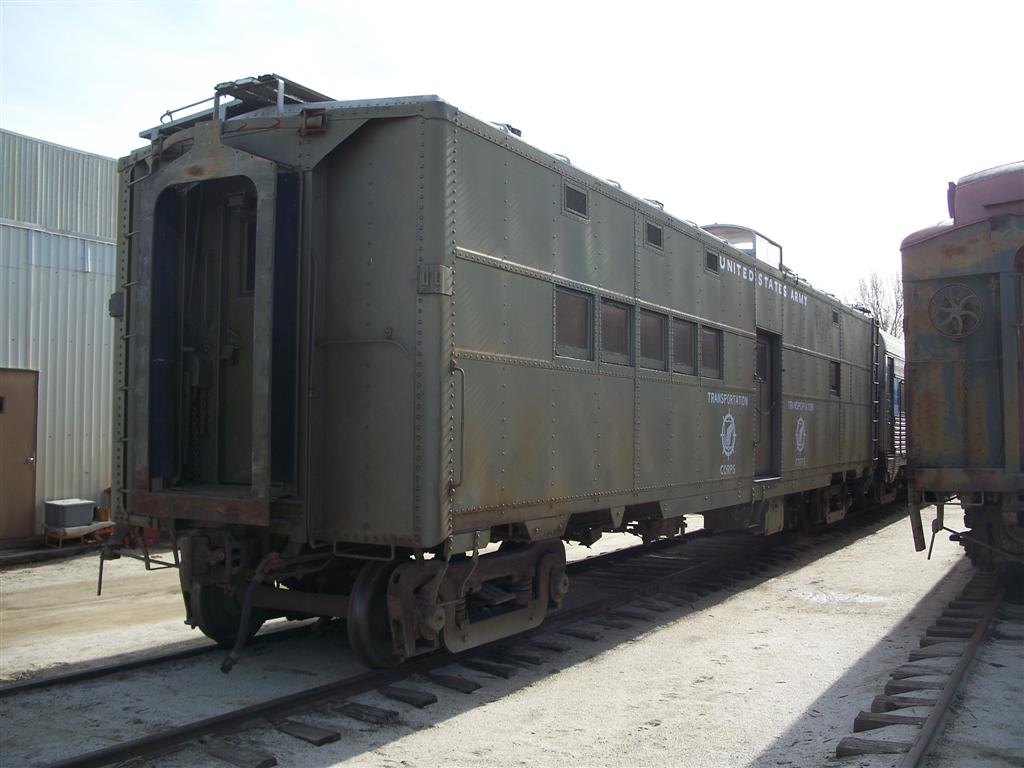Shipped to San Diego on its own wheels at a cost of $816.43, and fire-damaged enroute, DODX #G-10 arrived at the museum's Miramar NAS storage site January 14, 1974. Restored by museum workers, it was painted dark green with silver roof and renumbered DODX G-10, but not relettered. Displayed at the La Mesa depot, it was used on several SD&AE El Cajon branch museum trains from May 1982 to July 1983. It served as tool car on the PSRMA's July/August 1983 "Great Freight" to Campo; on work trains; and was a passenger car on the first 1986 Miller Creek trains. Refurbished in April 1987, the car was repainted olive drab with silver roof. Its Army lettering and Transportation Corps insignia were reapplied in February 1988, but not its number. As USAX #G-10 again, the car is being temporarily used as a restroom and refreshment car on museum excursion trains. In the future it will also house displays of military railroading.