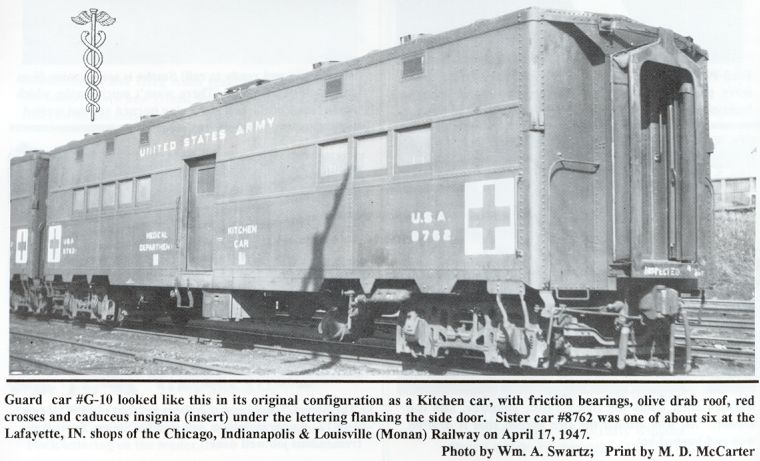To feed personnel on wartime troop and hospital trains, 440 troop kitchen cars & 60 ambulance kitchen cars were built, owned by the Defense Plant Corporation, operated by the Pullman Company, and assigned to the Transportation Corps or Medical Department of the Army Service Forces. This was an ambulance kitchen car (generally called a hospital kitchen car), with red crosses on its olive drab roof and sides, and white Medical Department lettering and caduceus insignia (a winged staff with entwined snakes).It was numbered USA #8764, 8765, or 8769. The car is 54' 2-1/2" long, 9' 11-1/2" wide, and 13' 6-1/2" high, and has four-wheel trucks with Hyatt roller bearings, Vapor Car steam heating, an air-pressure water system, and battery-powered lighting system. It originally weighed 77,500 lbs.(38.75 tons) and had friction bearings. In one half of the car are a work table, utensil drawers, cupboards, a refrigerator, two large sinks, water tanks, two cast-iron, coal-fired Army ranges in tandem, a wood-storage bin, and a half-ton coal box with rooftop hatch. The other half has a shower, toilet, fold-up sink, & water tanks, and originally had a bread locker and meatcutting tables.