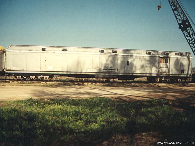 Built as a horse/express car in the 1990-1999 series and numbered ATSF #1997, the car is 82' 2" long (78' 4" inside) & weighs 156,300 lbs. (78.15 tons). It has a 9' 6" high sliding door on each side, Miner Safety brakes, six-wheel trucks from General Steel Castings, and Timken roller bearings (added in the late 1940s). The car was originally painted Coach green (dark olive) with yellow lettering. It may have been repainted solid Medium grey with a black roof and white lettering between 1953 and 1971, to distinguish it from non- roller bearing cars, which remained Coach green.
