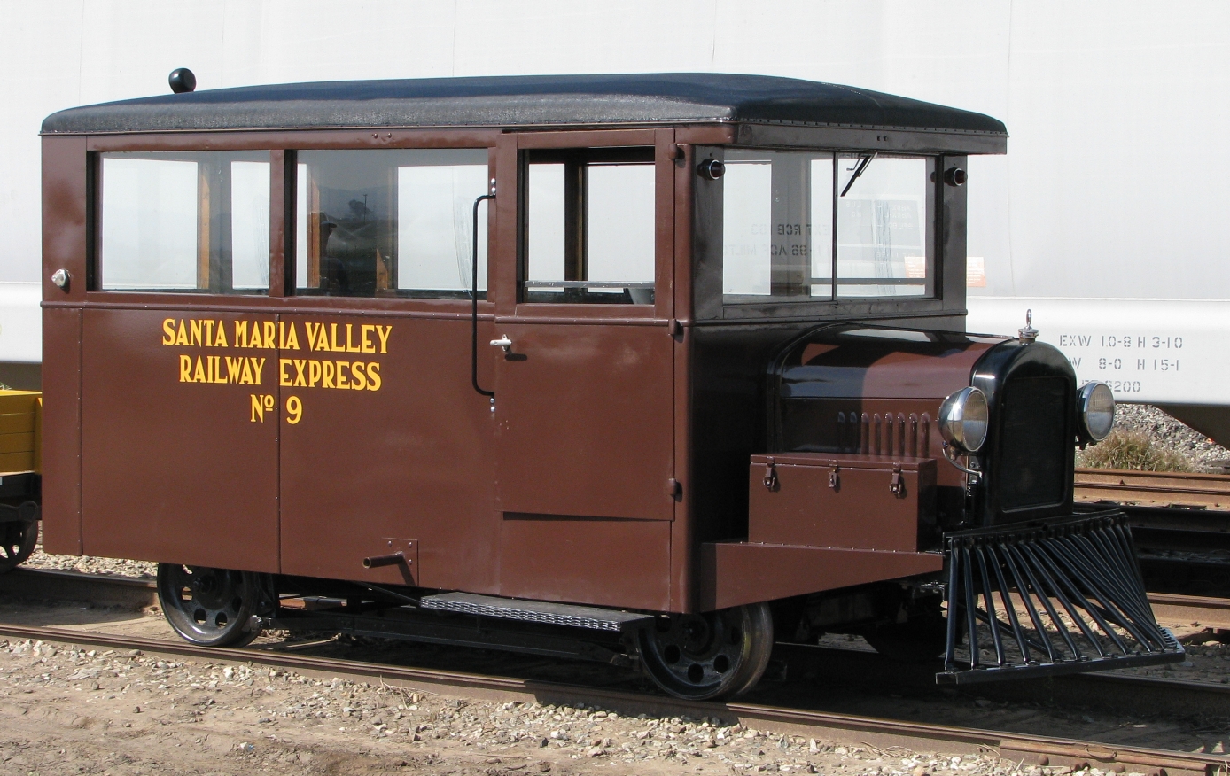 Although designed to carry twelve people on two 6-seat padded side benches, the car was purchased mainly for mail and express service by the Santa Maria Valley Railway, which numbered it SMV #9. An iron safe was placed in the car, which was so heavy that if not in the center when the car was turned on its jackscrew, the car might topple over! It ran on SMV's 18-mile line from a Southern Pacific connection at Guadelupe to Santa Maria & Gates Station,CA. SMV #9 never ran faster than 35 mph or carried revenue passengers, though it reportedly transported undocumented workers to pick vegetables & fruits. In strawberry harvest season, it often pulled one or two four-wheel trailers. SMV #9 also served as an inspection car and auxiliary section car. It was retired from regular service about 1936, painted orange, and used in some maintenance-of-way service until 1962, when sold because of excessive engine repair costs to the Valley Pipe & Salvage Company of Santa Maria for scrap. Its radiator, drive shaft, and some other parts were removed and sold.