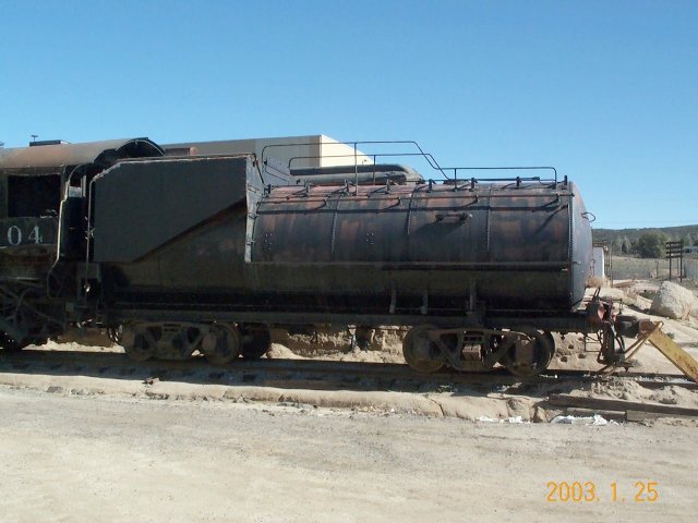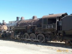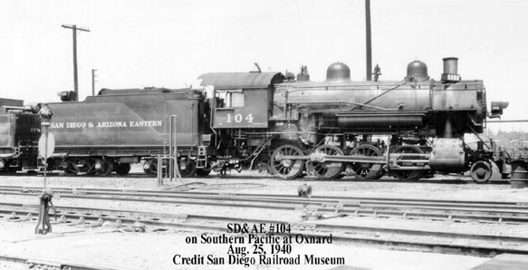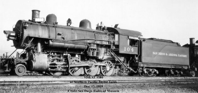 Built for the Southern Pacific for $17,969.01 and numbered SP #2720, it worked SP lines until purchased by the SD&A March 25, 1921 for $37,000 paid in January 1922. As SDA #104, it was used in freight service and on passenger runs, because it was the "smoothest-riding" SD&A engine. Beyond the San Diego-Campo-El Centro mainline, it pulled SD&A trains on the SP to Niland, Ca (connecting with the LA-New Orleans Sunset) and via Mexicali on the SP and its Ferrocarril Inter-California to Yuma, Az. (connecting with the LA-Chicago Golden State, Californian, & Imperial). In 1923 it was in a promotional film, Carriso Gorge, The Magnificent, and in 1926 in the Goldwyn movie Red Lights, with Marie Prevost and Jean Hersholt, filmed near Hipass. It became SDAE #104 when SP acquired the SD&A in 1933. It was in Los Angeles in December 1937 and February 1940, and was repaired in July 1939 at SP's Bayshore yards in Brisbane, Ca. Photo 1, Photo 2