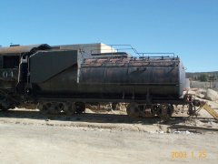 This Class C-8 (Class C-57-22/30-192-S for its driver and cylinder size, and weight on drivers) is a 2-8-0 Consolidation road engine, builder's #23899. Originally weighing 206,800 lbs. (103.4 tons), 183,100 on its 57" drivers, it had a 200 lb. boiler pressure and 43,300 lb. tractive effort. A superheater added December 21, 1918 at Sacramento increased these to 216,700 lbs. (108.35 tons), 191,900 on drivers, 210 lbs. pressure, and 45,470 TE. It has 22" x 30" cylinders, Stephenson link valve gear, and is 38' 5 3/16" long, 10' 0" wide, and 15' 8 3/4" high. It originally had a "square" tender, replaced in 1940 by a Vanderbilt one weighing 67,600 lbs. (33.8 tons) empty and 174,300 lbs. loaded. Between 1951 and 1955 it received a Vanderbilt 90-C-6 (for water capacity/cylindrical shape) tender, #778, weighing 57,600 lbs. (28.8 tons) empty and 166,100 lbs. loaded, with capacities of 9,000 gallons of water and 3,535 of fuel oil. It's 34' 8 3/4" long, 9' 10 1/4" wide, and 12' 8 1/2" high.