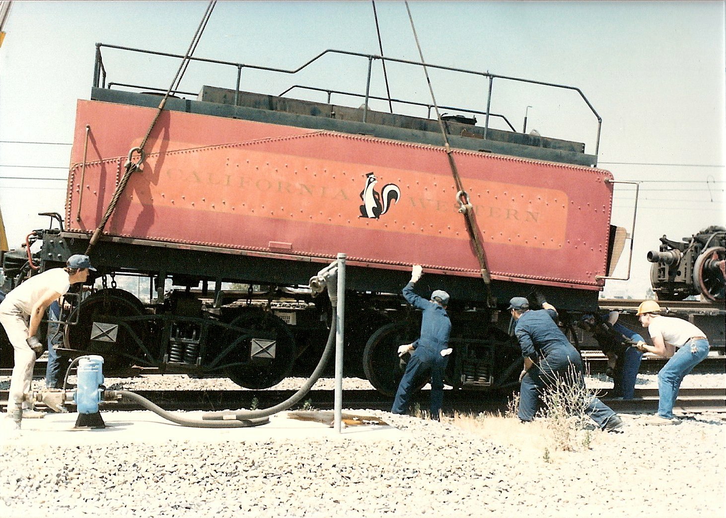 In 1968, the Mallet was bought by Georgia-Pacific Corporation's 40-mile California Western Railroad, for use on Fort Bragg-Willits redwood area Super Skunk tourist trains. Rebuilt as CW No. 46 at the Fort Bragg shops in 1968-70, its tanks and fuel bunker were removed, making it a 2-6-6-2 without the "T". Ballast was added under the running boards to restore traction, and also new cab seats, spark arrester, and an ex-SP whistle. It was painted vermilion, red, gold, and black, with a skunk cartoon on the rebuilt tender's now-rectangular sides. CW No. 46 began its passenger service on the well-known tourist line August 20, 1970, pulling ex-Erie Stillwell coaches and ex-SP commuter coaches. Leased to Willis Kyle's Mendocino Coast Railway in 1977, the CW ended steam service in 1981.