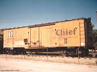 Day 4 In the early hours of the morning, SFRD 32670 and the other cars of Extra 132 east were drawn up alongside the Needles ice deck while ice thumped and rattled into their bunkers. A sheaf of papers in the hands of the deck foreman spelled out the individualized icing instructions for each car. Then a new engine crew picked up its clearance card, climbed into the cab, tested the air, and rumbled out of town for the long steady climb east, to the end of the division at Seligman. With dawn breaking. Extra 132 east continued on to Ash Fork, Williams, Flagstaff, and Winslow. At Winslow, the 132 was replaced by four-unit 137L-A-B-C, another set of the FT's delivered during World War II. In summer, the cars would have been iced again at the Winslow ice deck, but re-icing wasn't necessary after a night run across the desert in October so the GFX continued east after a brief stop, following the Albuquerque Division's double-track main line into New Mexico. Gallup came and went, the sun declined in the west, and at Dalies the train swung right onto the Belen cutoff for a brief run down the New Mexico Division's El Paso Line and then left into the big yard at Belen. Time for another sojourn at the ice deck while the temperatures in the cars were checked, the bunkers were re-iced, and the car oilers and inspectors made their rounds.